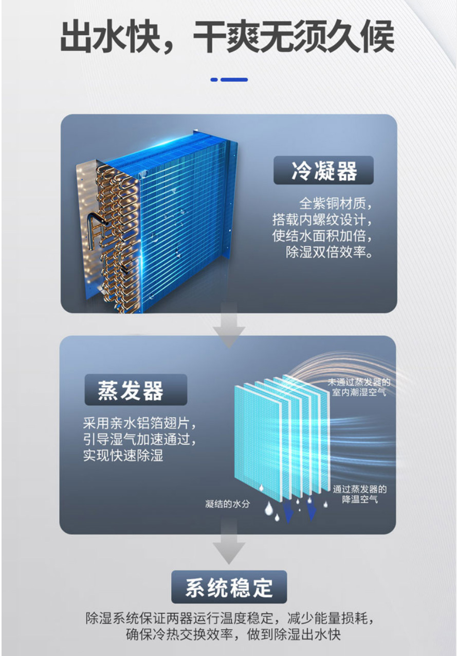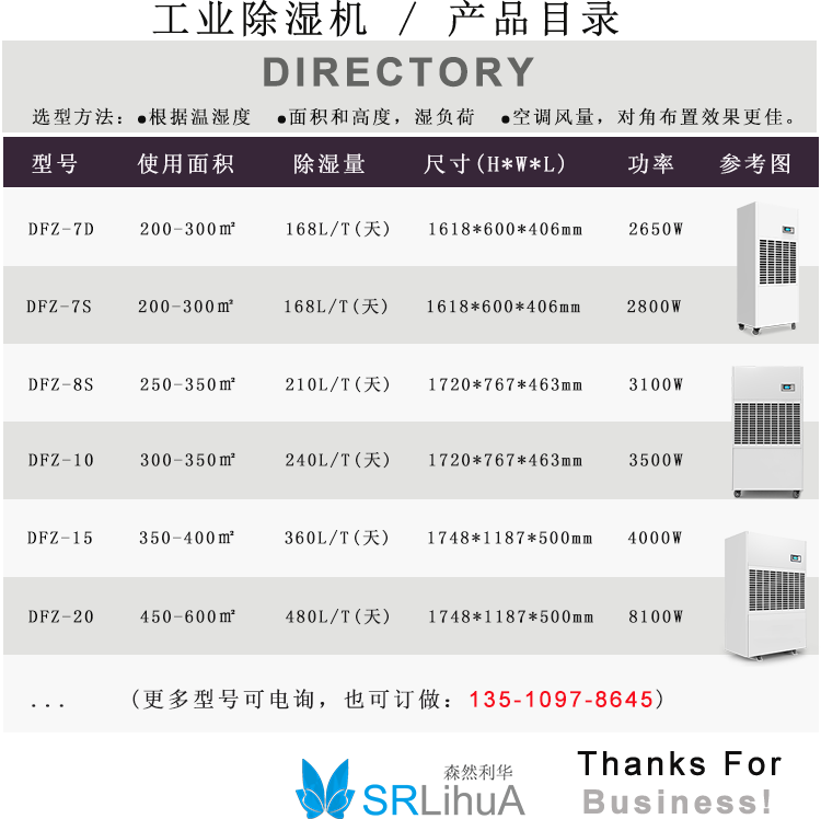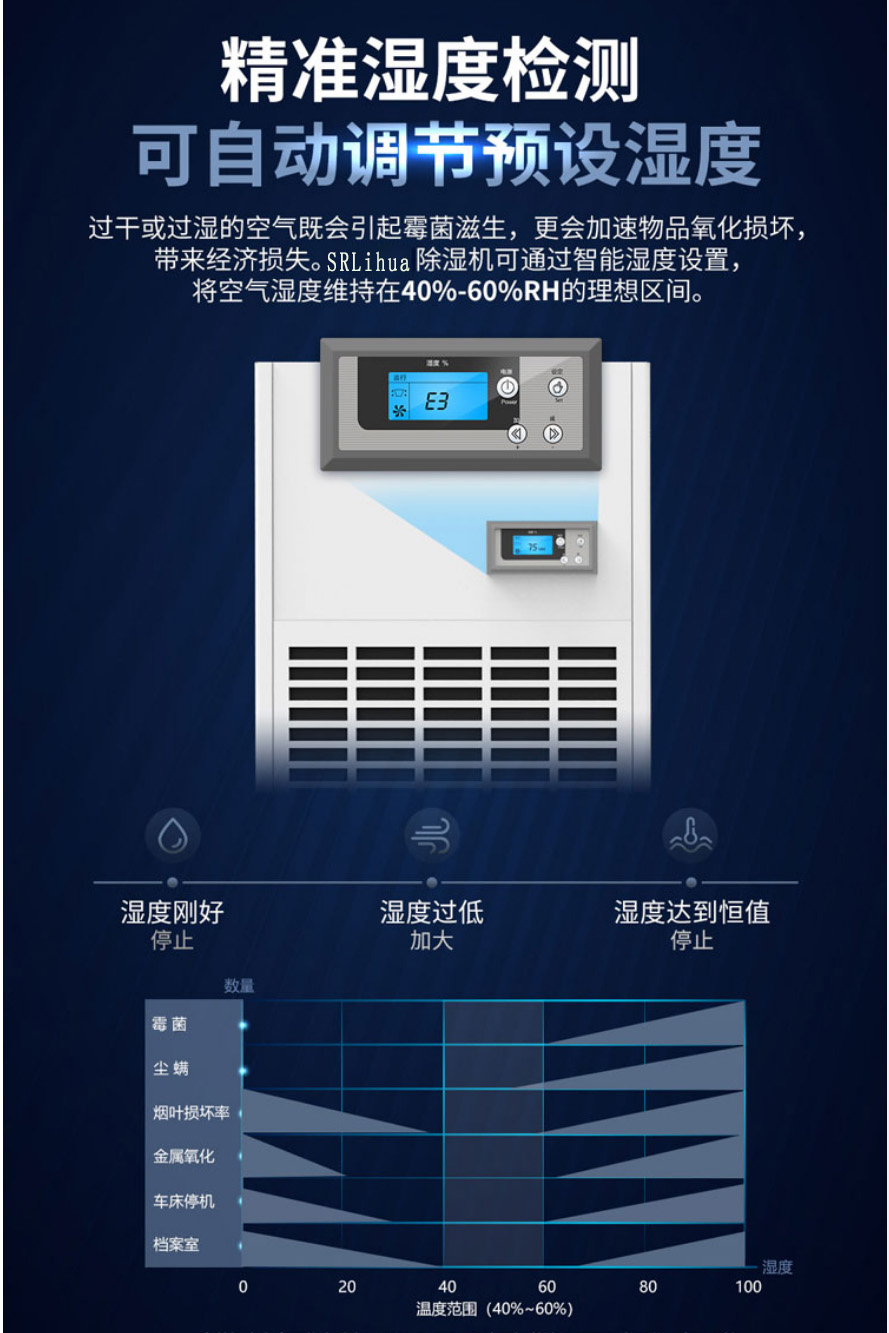 电源:220V/50Hz 除湿量:160L/T(天) 风量:2000m3/H 功率:2650W 制冷剂:R22/407C 除湿面积:200-300㎡(高2.6m)